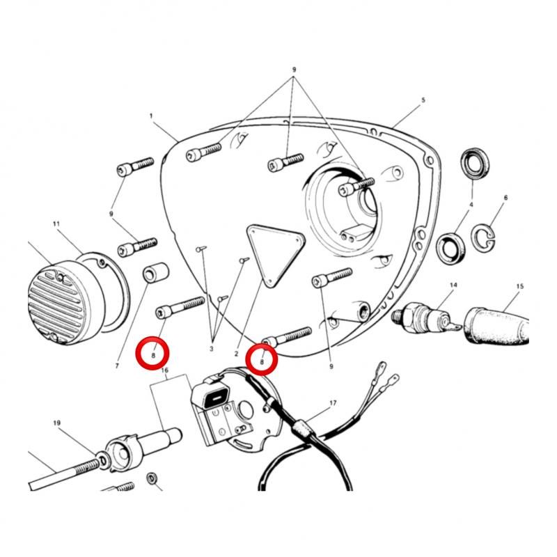 T140およびTR7モデルに採用 - ギアボックス外側カバーと内側カバー、タイミングカバー、4バルブオイルポンプ用ショート固定ネジ。